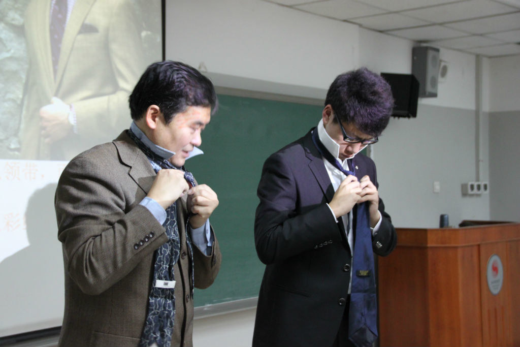 本次活动的主题是关于职业着装的注意事项。活动一开始,赵京慧老师就和大家分享了职业素养与观念,并告诉了大家穿着得体在今后的工作中的重要性,随后便开始为大家详细的介绍了职业着装的要求与规范。赵老师对男士和女士的着装要求分别进行了介绍,男士着正装时颜色不能超过三种,简洁大方为宜,西装合身不宜过于肥大,此外还介绍了几款不同的正装,以及各款正装适宜的场合。女士的正装样式相较于男士款式和选择更多,女士着装需要注意着裙装时,裙子不宜过长也不能过短,饰物少而简洁能起到画龙点睛的作用。赵京慧老师对职业着装的各个细节都做了详细的介绍,并配上图片,使得讲解更加生动形象,在讲解过程中,赵老师还对在座同学的正装进行点评,指出他们着装存在的问题,通过这样的方式让同学们对职业着装的要求有了更清晰直观的了解。讲座结束后,同学们还针对自己所感兴趣的问题对赵老师进行提问,赵老师对同学们的问题一一进行了详细的解答,最后还教授同学们打领带的方法。